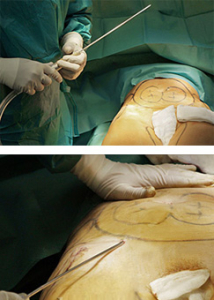 Канюли, используемые для водоструйной липосакции, отличаются от классических. Внутри канюли размещены не одна, а две трубочки. Через первую подается струя жидкости, отделяющая жировые клетки, через вторую этот жир и избыток жидкости отсасывается. Липосакция живота начинается с обработки верхней части. Канюля вводится через крошечный разрез в пупке для того, чтобы впоследствии здесь нельзя было обнаружить никаких следов.