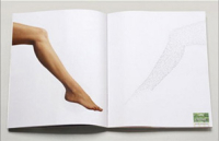 Интересную идею в использовании «медиа-креатива» в журнальной рекламе продолжает реклама средства эпиляции. Страницы журнала изначально склеены, поэтому чтобы просмотреть рекламное объявление, читателя заставляют проделать подготовительную работу.
