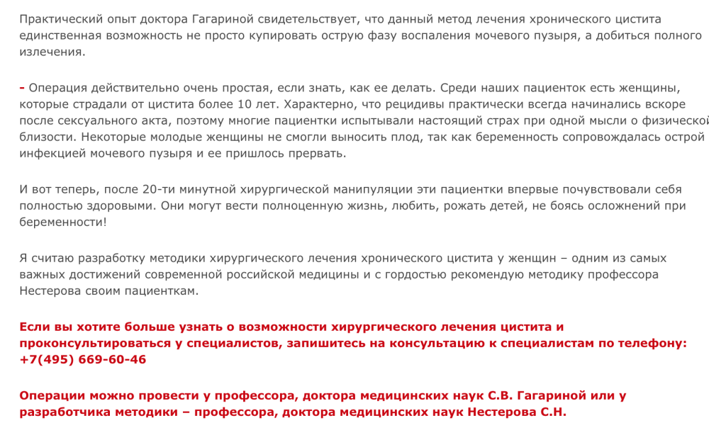 Вы можете представить себе такое? теперь от хронического цистита можно избавиться , сделав операцию , которая занимает всего 20 минут и никакой реабилитации не требуется!!! что за гений это делает? я вам отвечу. это метод проф Нестерова в тандеме со своей коллегой и женой, профессором и доктором медицинских наук — Гагариной ( главным специалистом в интимной пластике)