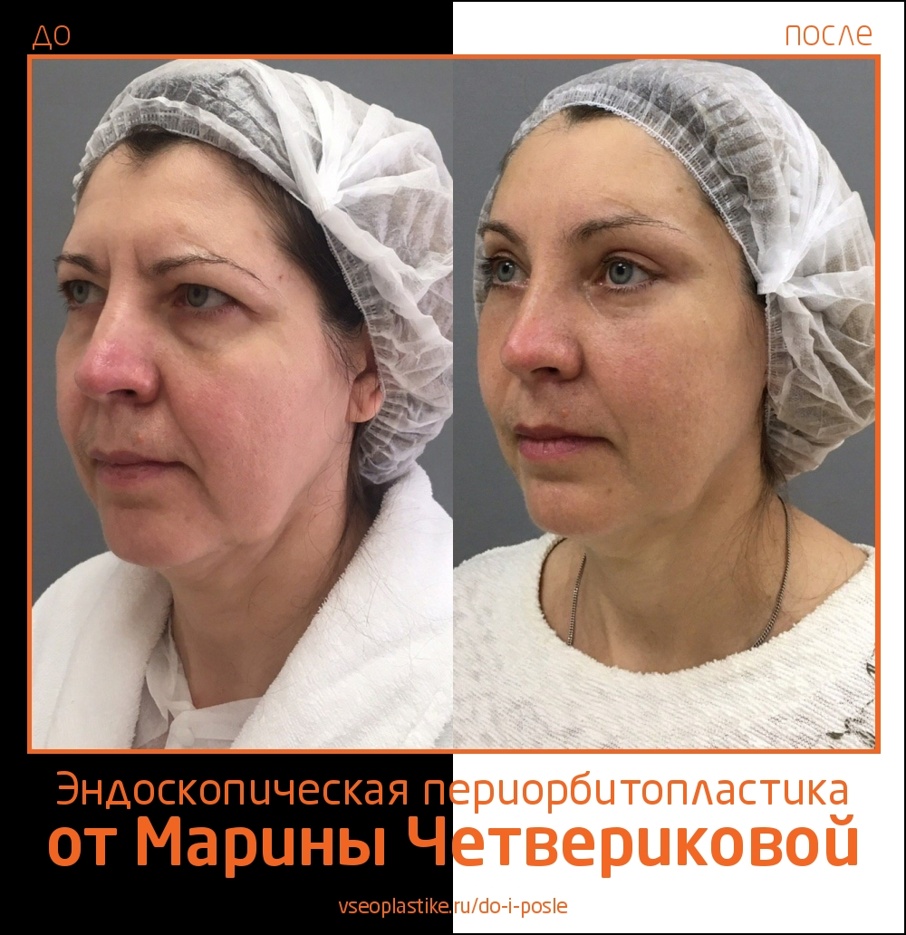 Пациентке Марины Анатольевны Четвериковой была выполнена эндоскопическая периорбитопластика, верхняя и нижняя блефаропластика. Фото через 4 месяца после операции.