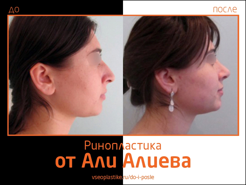 Пациентка Али Алиева до и после ринопластики. Оцените полученный результат коррекции носа.