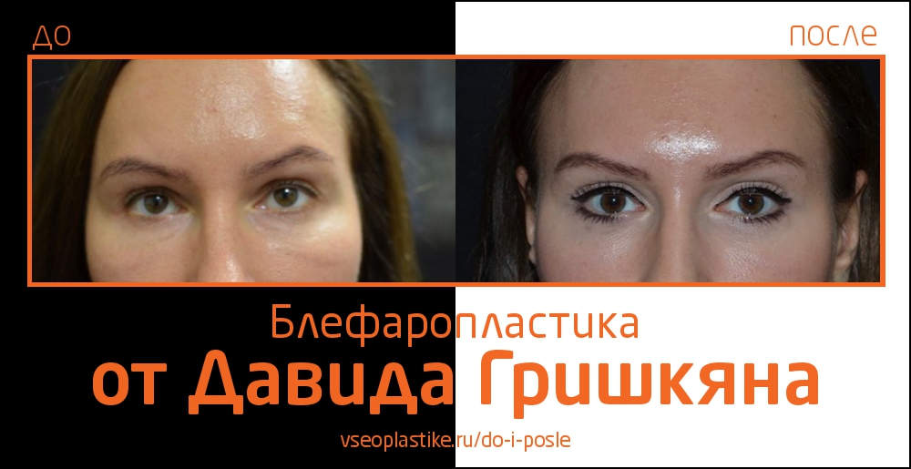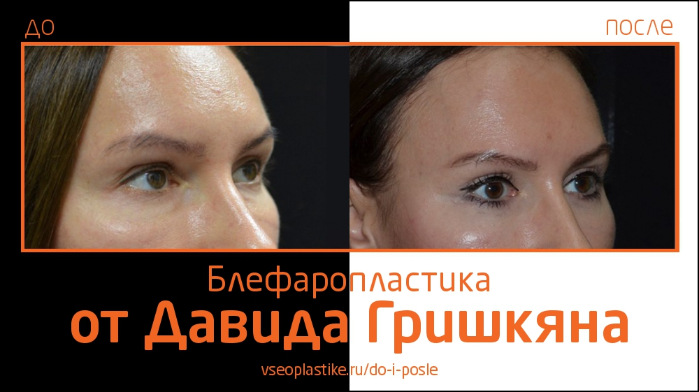 Пациентка Давида Гришкяна до и после операции. Проведенная современными методами блефаропластика позволяет улучшить внешний вид не только век, но и бровей и скул.