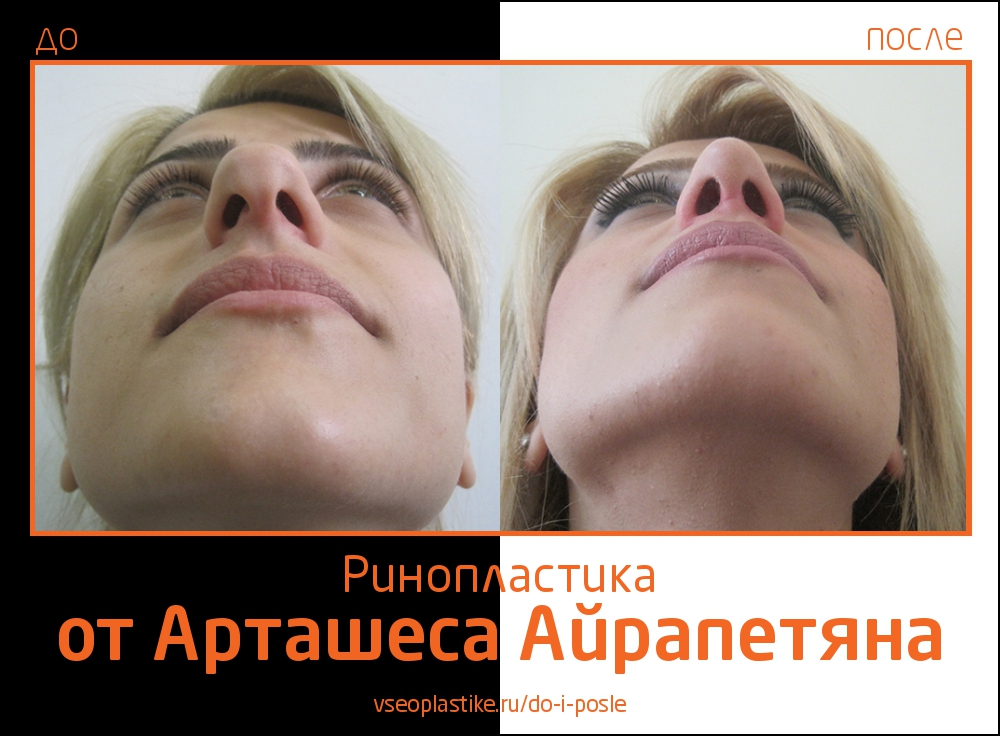 Пациентка Арташеса Айрапетяна до и после ринопластики. Данные фотографии демонстрируют, каких изменений можно добиться посредством коррекции носа.
