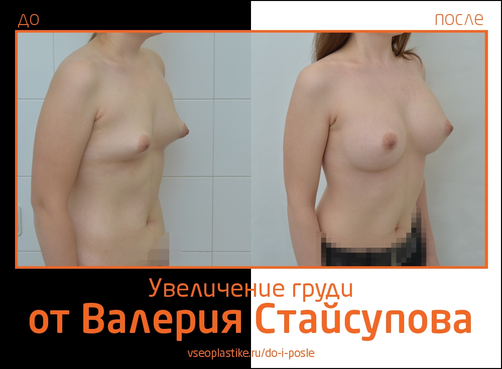 Пациентка Валерия Стайсупова до и после увеличения груди. В ходе вмешательства были установлены импланты Ментор объемом 275 сс (аксиллярный доступ).